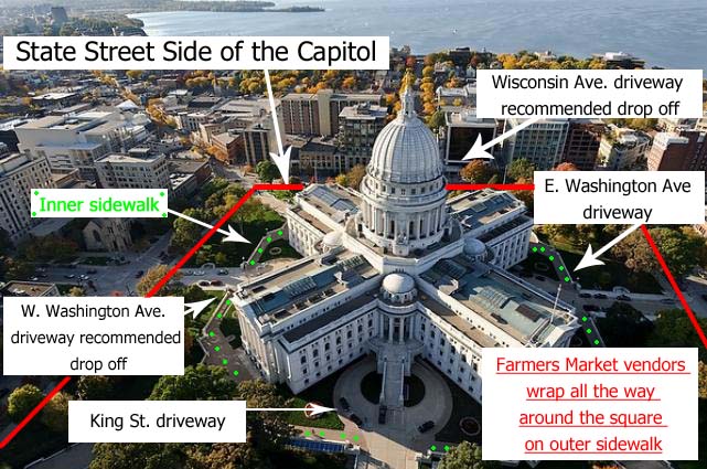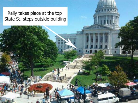 As an option for those in wheelchairs or people not able to walk from the parking ramps to the State Street side steps you can be dropped off by vehicle on the Wisconsin Ave. or West Washington Ave. side of the building in the circle driveways. Then you can walk to the State Street side of the building or be pushed in your wheel chair on the upper/inner sidewalk that is closest to the building. The rally takes place at the top of the steps on the State Street corner of the building.