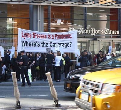A Lyme disease silent demonstration in front of the New York Times building in midtown, displayed a large sign that read, “Lyme disease is a pandemic. Where is the coverage?” Photo Credit: Ben Shapiro