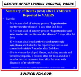 https://madisonarealymesupportgroup.com/2017/07/01/pbs-lyme-vaccine/ In a vile cesspool of conflicts of interest are university patent holders, drug companies, and the FDA itself as another patent holder. It generated 40 million dollars before it was yanked. (2008, Drymon)