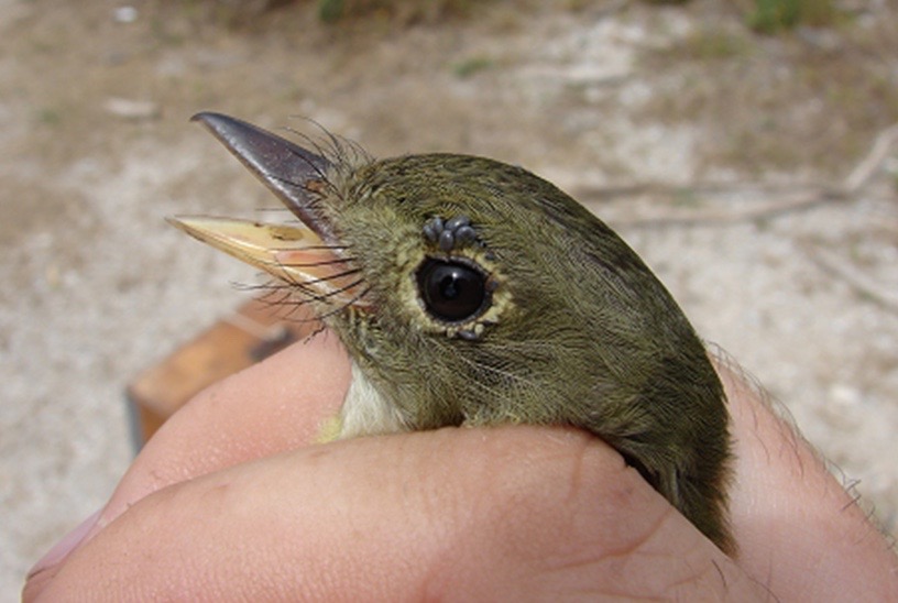 An Acadian Flycatcher with larval neotropical ticks. (Courtesy Tim Guida)