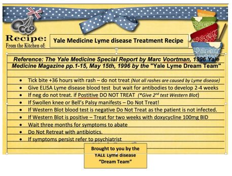 Insurance companies and Medical boards can use any “recommendation of short-term antibiotics” as an excuse to sanction Doctor’s not treating to those specific guidelines. This would literally destroy effective treatment for the scores of lyme patients in this state and the 30,000 newly infected here annually.