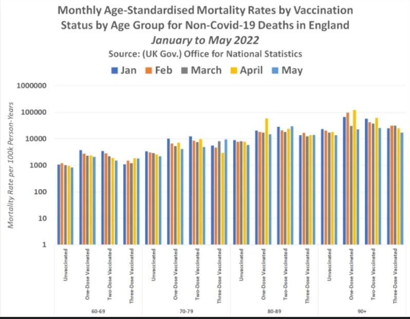 Here are some older ONS data (to May, 2022) showing the unvaccinated have the lowest per capita mortality rate in the UK compared to the other variously-vaccinated:
