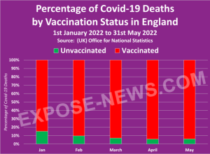 The dataset, which can be downloaded here and accessed on the ONS website here, shows that between 1st January 2022 and 31st May 2022, the vaccinated population accounted for 9 in every 10 Covid-19 deaths, and 91% of those deaths were among the triple/quadruple vaccinated.