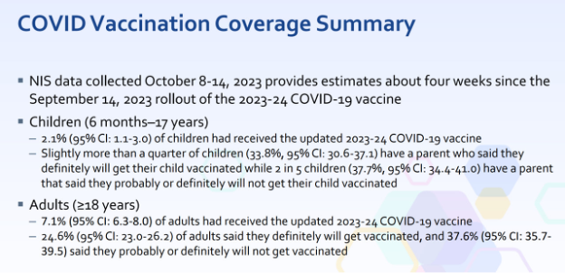 - The government’s National Immunization Survey showed 7.1% of adults and 2.1% of children self-reported getting the new 2023-2024 COVID shot. These numbers are higher than reality, because the data comes from people who are willing to answer a government survey, giving a very slanted picture.