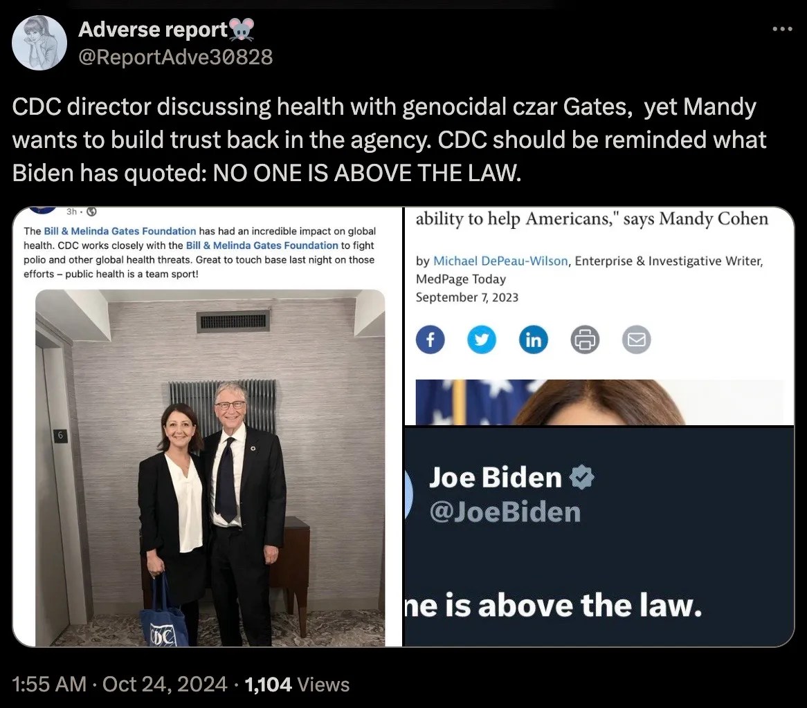 Gates is being indicted in the Netherlands for lying about the COVID shot, who is known for his duplicity as his former doctor states he refused to ‘vaccinate’ his own children. Previously boasting that he’s bipartisan and doesn’t get into politics, he’s been busted by Robert Kennedy Jr. for routing 50 MILLION through a 501c4 organization to the Harris campaign, never intending it to become public knowledge.