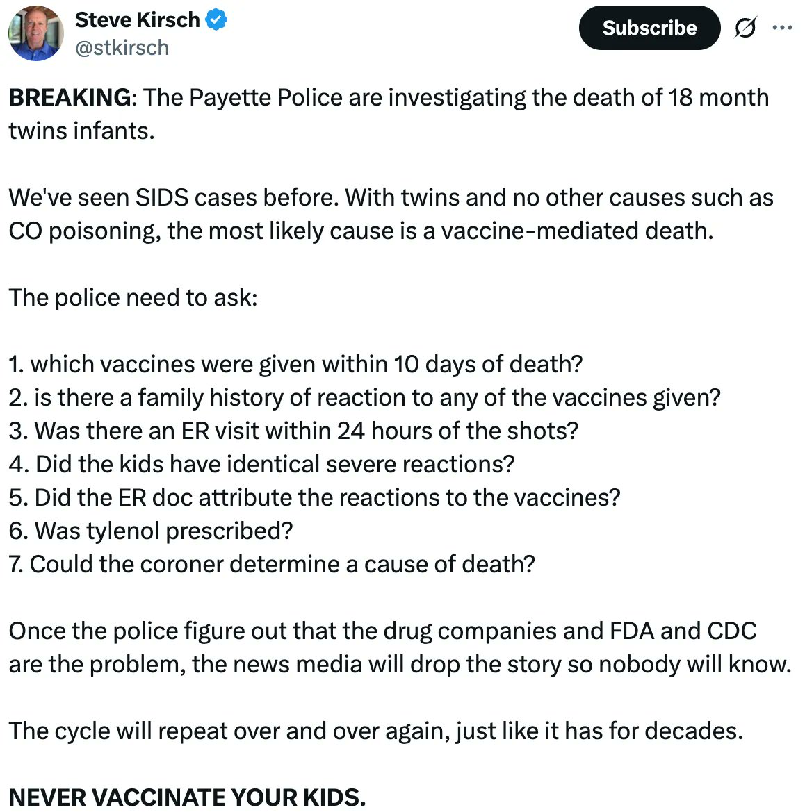 I know of 7 instances in the literature where twins died on their backs at night following vaccination. Were vaccination not politicized, this would constitute gold standard proof vaccines cause sudden infant deaths. Additionally, no one who knows this family suspects homicide. ~ A Midwestern Doctor