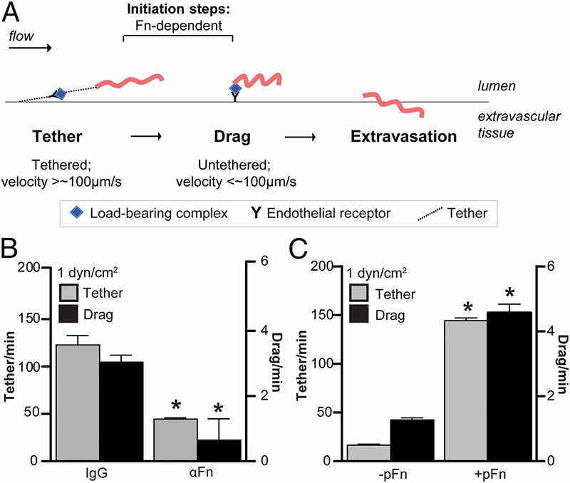 Dependence of B. burgdorferi–endothelial interactions under physiological shear stress on pFn. (A) Schematic illustrating initiation steps (tethering, dragging) of the B. burgdorferi–endothelial interaction cascade leading to bacterial transmigration across endothelial barriers into extravascular tissues. Tethering bacteria anchor to endothelial surfaces via tethers, pause repeatedly as they move over endothelial surfaces, but move faster than 100 μm⋅s−1. Dragging bacteria move more slowly (<100 μm⋅s−1) and are untethered. Both tethering and dragging are Fn-dependent in mouse PCVs (18). There are reduced numbers of B. burgdorferi tethering and dragging on primary human endothelial monolayers in flow chambers at typical PCV shear stress (1 dyn/cm2) following treatment with polyclonal anti-Fn antiserum (B) and depletion of pFn from serum in bacterial cultivation medium (C). Numbers of tethering and dragging GFP-expressing B. burgdorferi (strain GCB966) in the presence of nonspecific IgGs or polyclonal αFn IgGs were measured by manual counting. In B, GCB966 was cultivated in the presence of mouse blood before imaging. In C, bacteria were cultivated without mouse blood to eliminate all sources of pFn. In C, −pFn indicates pFn-depleted growth conditions; for +pFn samples, bacteria grown under pFn-depleted conditions were supplemented with human pFn (+pFn) to the concentration present in blood (0.3 mg/mL) before imaging. Summary values: mean ± SEM. Statistics: two-way ANOVA, Holm–Sidak posttest (n = 3 independent bacterial and endothelial cultures per group). *P < 0.05 vs. IgG (B) or −pFn (C) within the same interaction type.