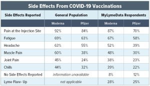 This table shows side effects from the clot shot in both the general population as well as those with Lyme/MSIDS. In short, nearly everyone in both groups had pain at the injection site. Most frightening is that anywhere from 60-70% experienced fatigue, anywhere from 40-63% headache,30-60% muscle pain, and 23-45% joint pain.